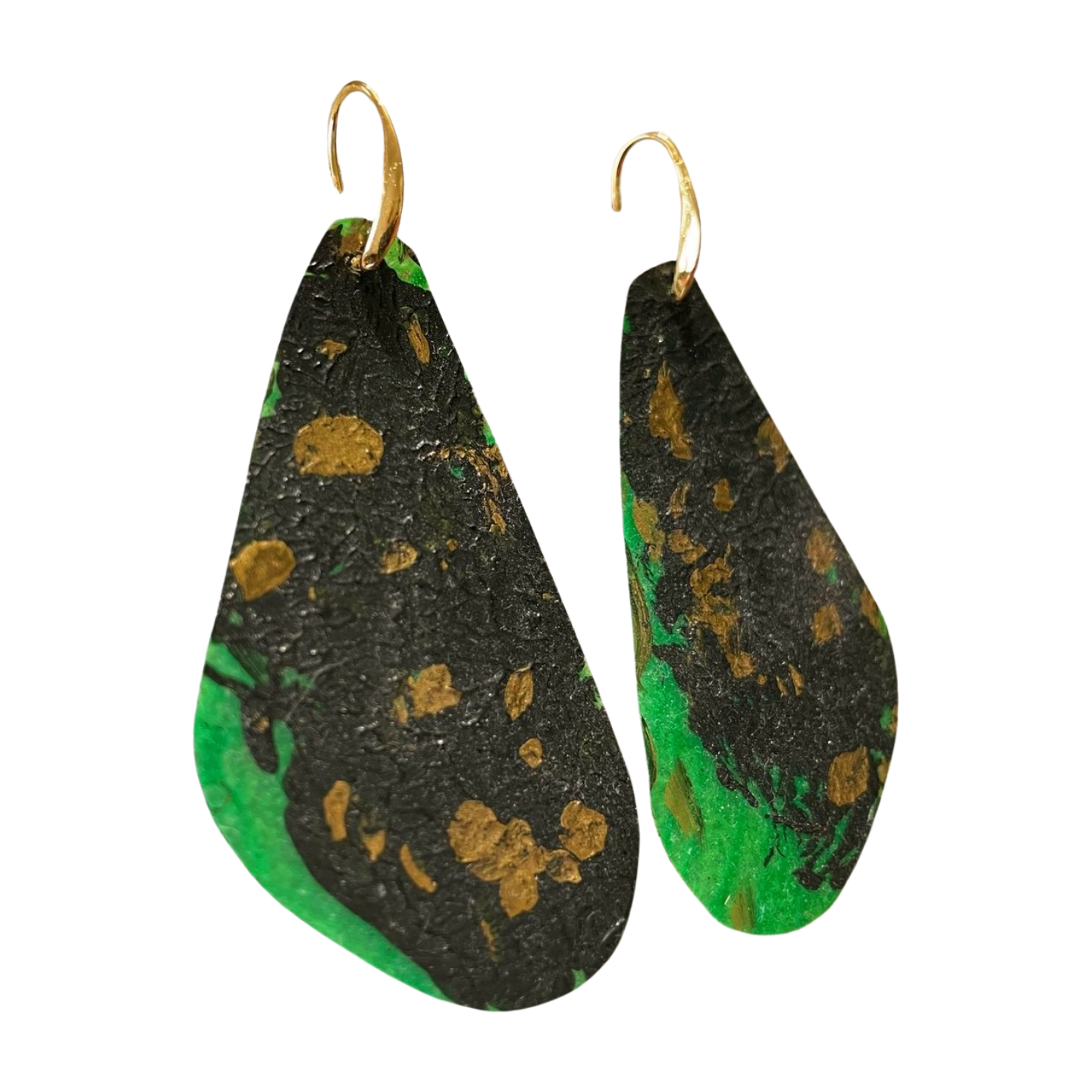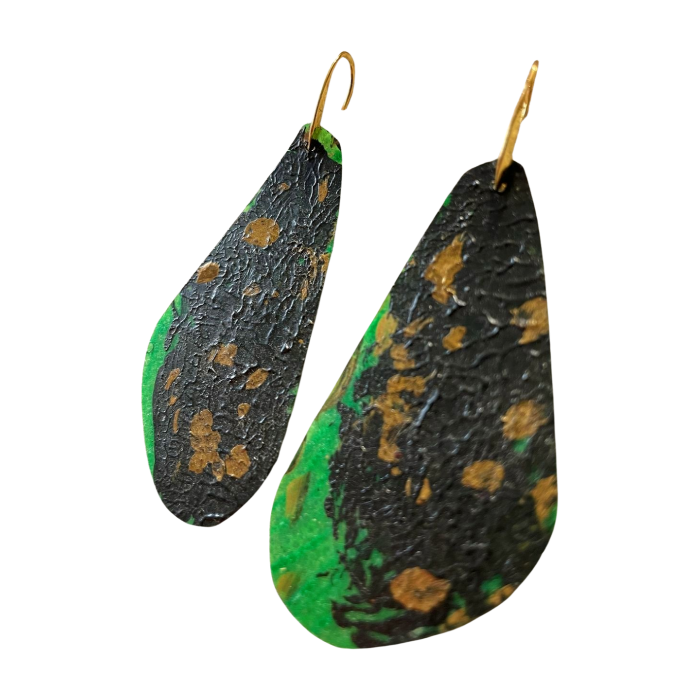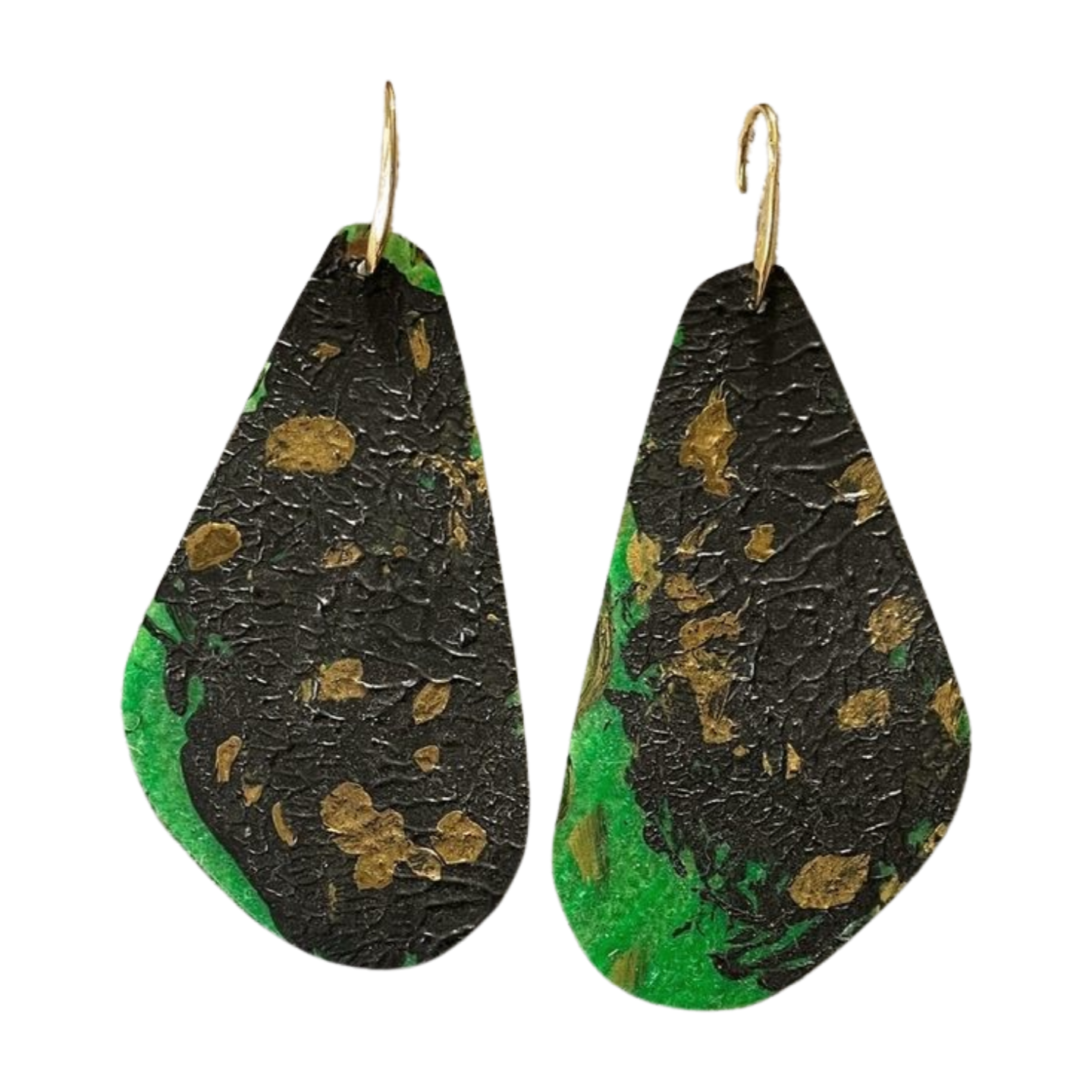 Realizate din folii de plastic si flacoane de plastic din locurile de evenimente. Sticlele sunt spalate, igienizate si pregatite pentru studioul meu de bijuterii, unde le lucrez personal. Bijuteriile sunt realizate printr-un proces complicat in care am taiat mai întai plasticul in forme inspirate din natura si forme artistice. Apoi, folosind caldura lumanarii, indoiesc foarte atent plasticul în forme frumoase, dupa care le pictez si le combin cu accesorii perfecte.