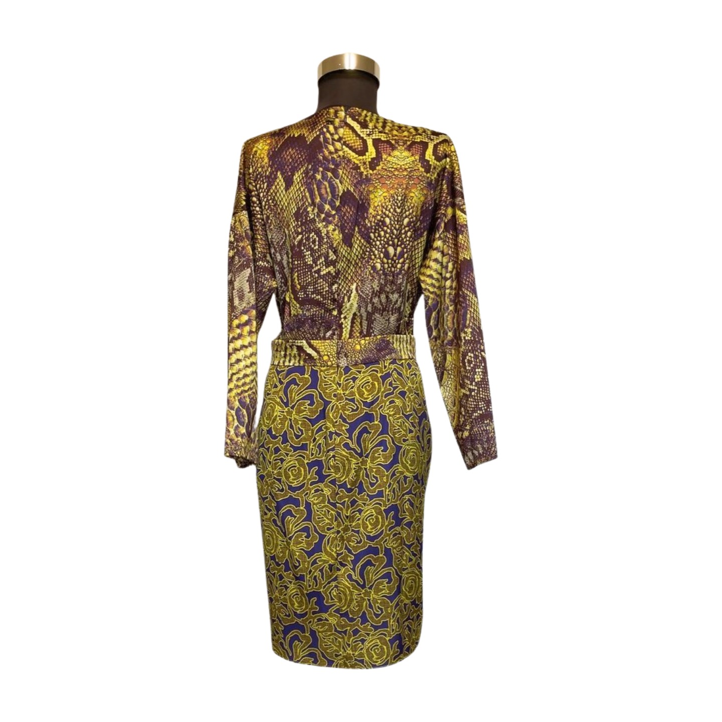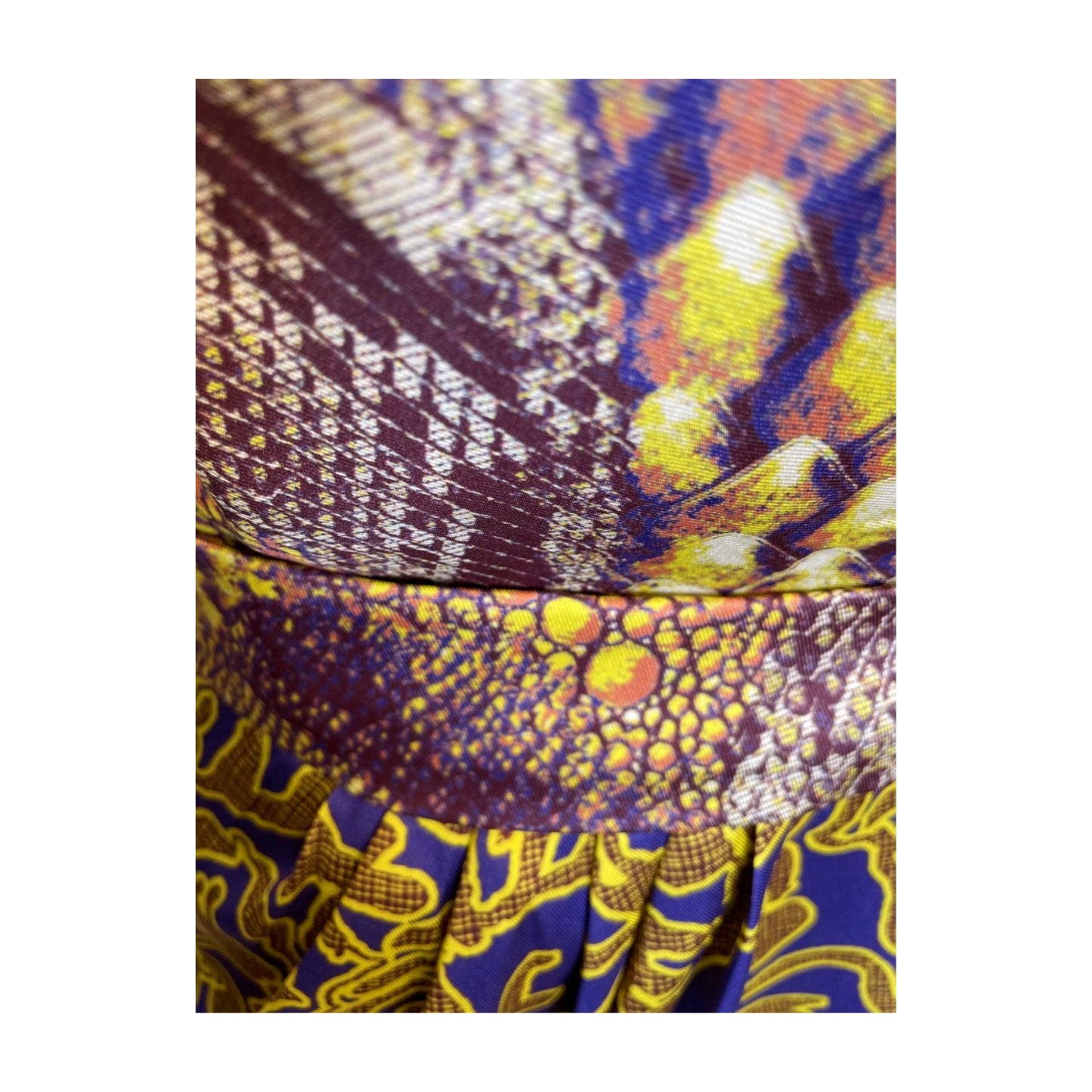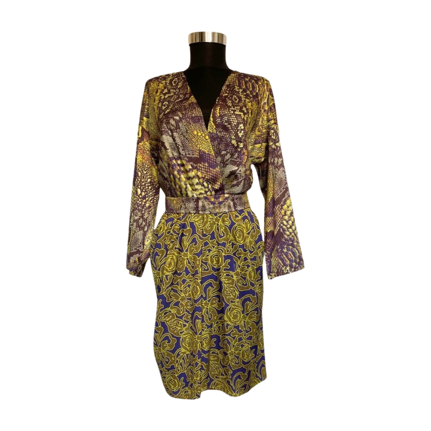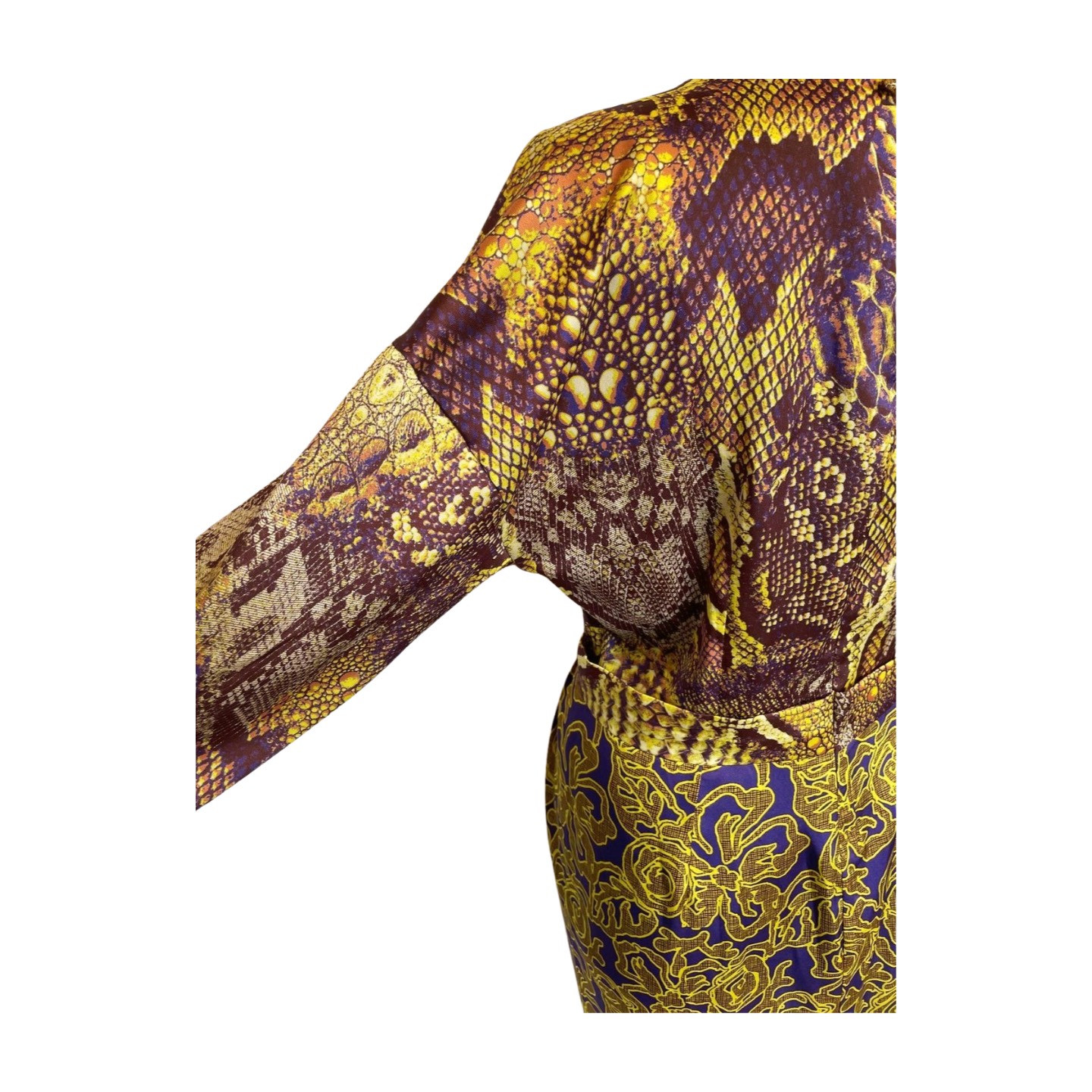 Rochie cocktail cu croială midi, realizată din materiale fluide și confortabile, ideală pentru apariții elegante. Designul îmbină printul animal cu elemente abstracte, într-o paletă cromatică vibrantă – galben solar și mov regal. Silueta este pusă în valoare prin detalii rafinate, iar combinația de culori și texturi creează un efect artistic și memorabil.